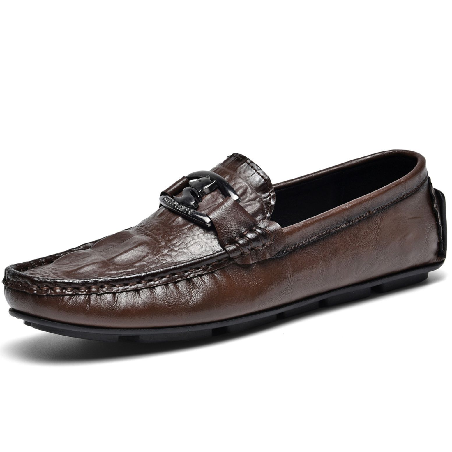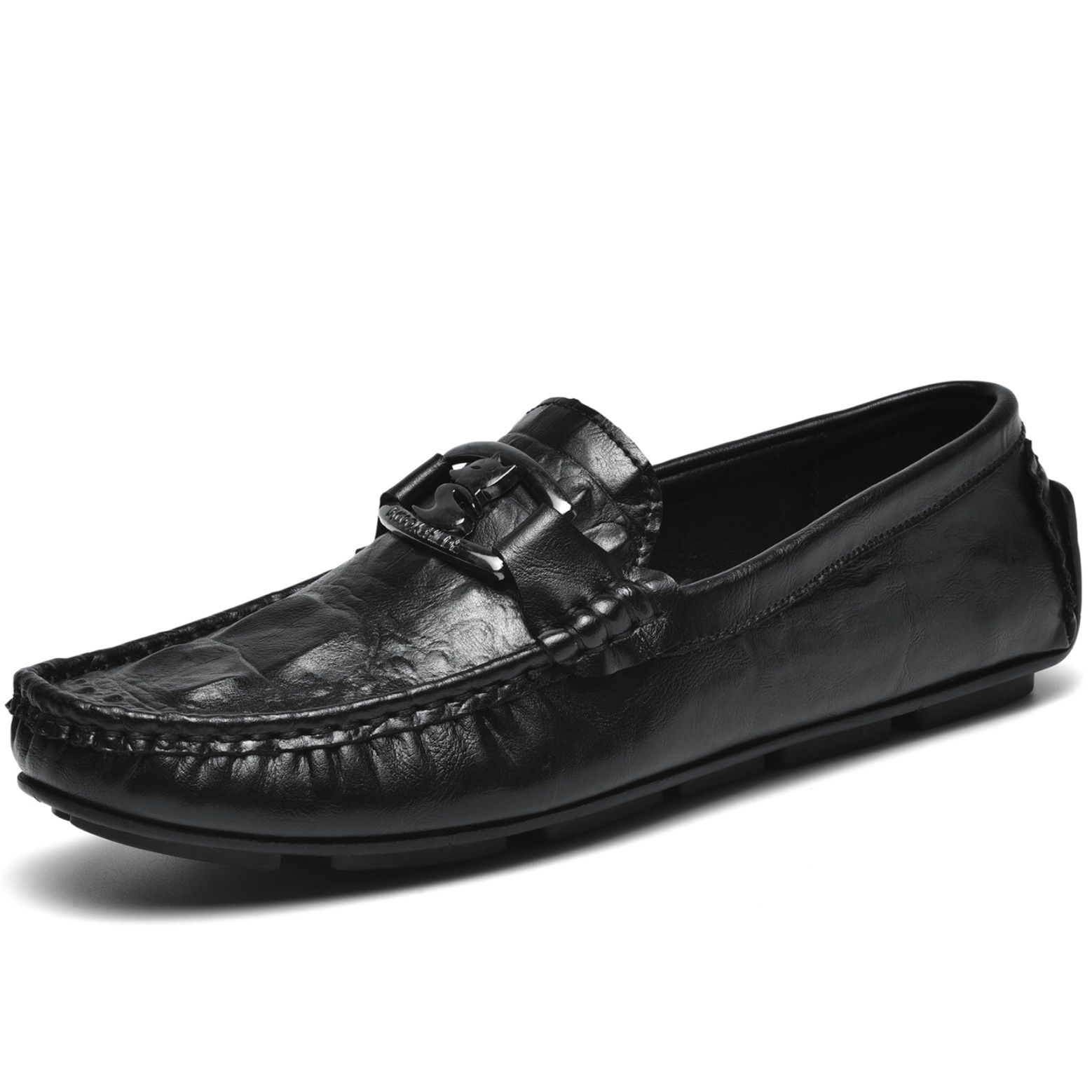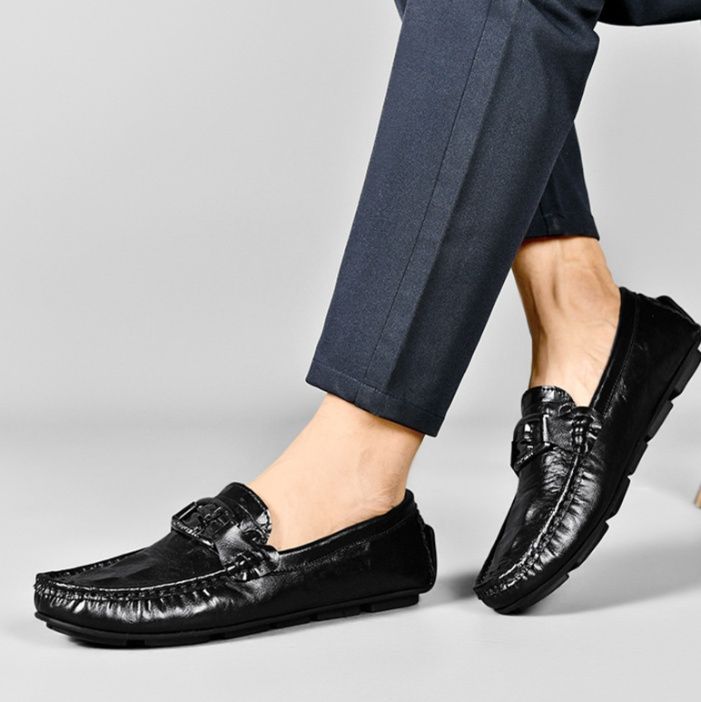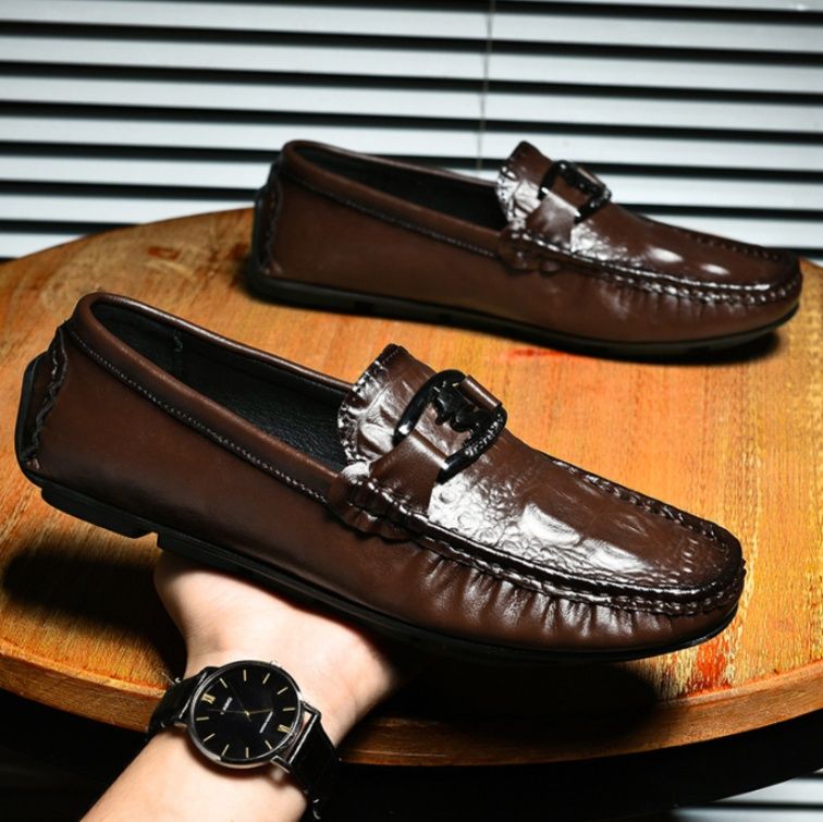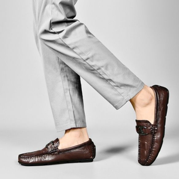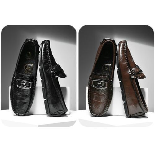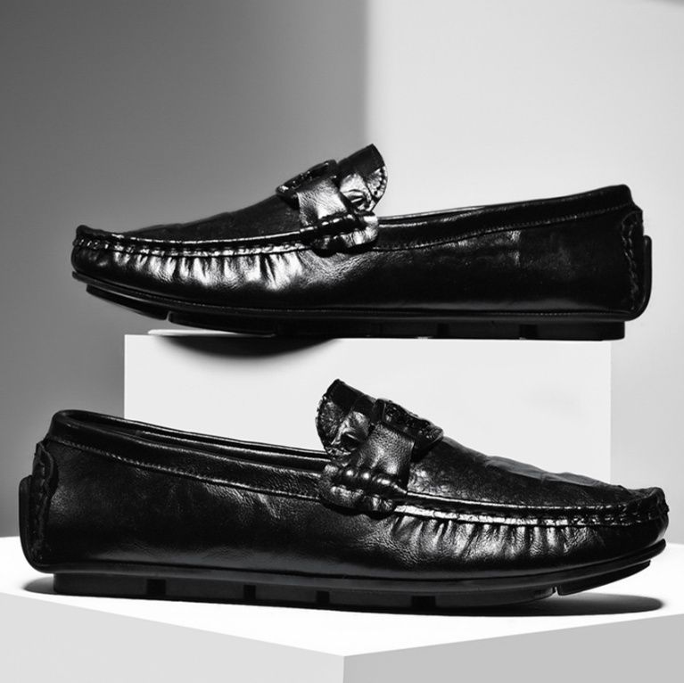 上質な牛革を使用したドライビングシューズです。 甲部分のメタル金具がアクセントとなり、洗練された印象を演出します。 ゴム底仕様で滑りにくく、運転時のペダル操作も快適に行えます。 ローファータイプで脱ぎ履きしやすく、カジュアルからビジネスシーンまで幅広く活躍します。 足に馴染む柔らかな革質と丁寧なステッチワークが魅力の一足です。